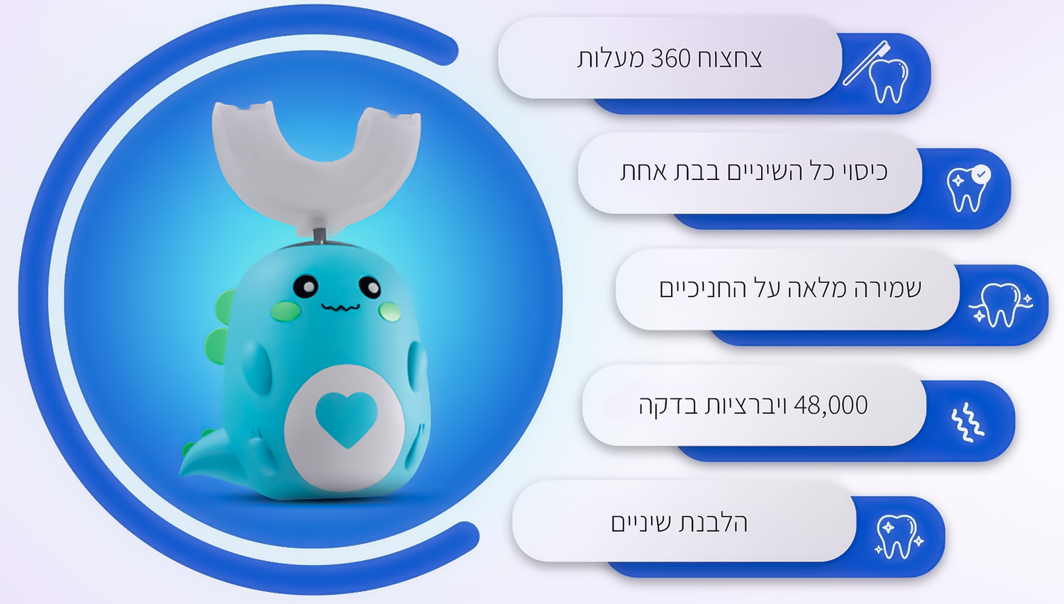 תוך 20 שניות הילד מסיים לצחצח לבד, עם חיוך נקי, שיניים לבנות וחניכיים בריאות!